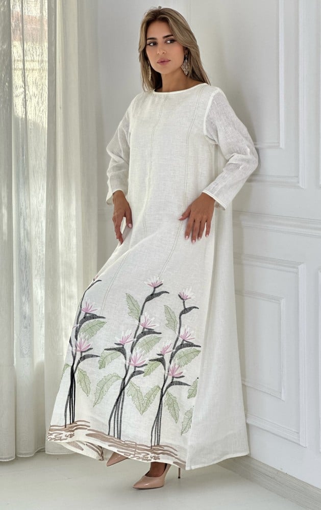 ثوب اللينن مطرز يُعد خيارًا مثاليًا لإطلالة تجمع بين الراحة والأناقة