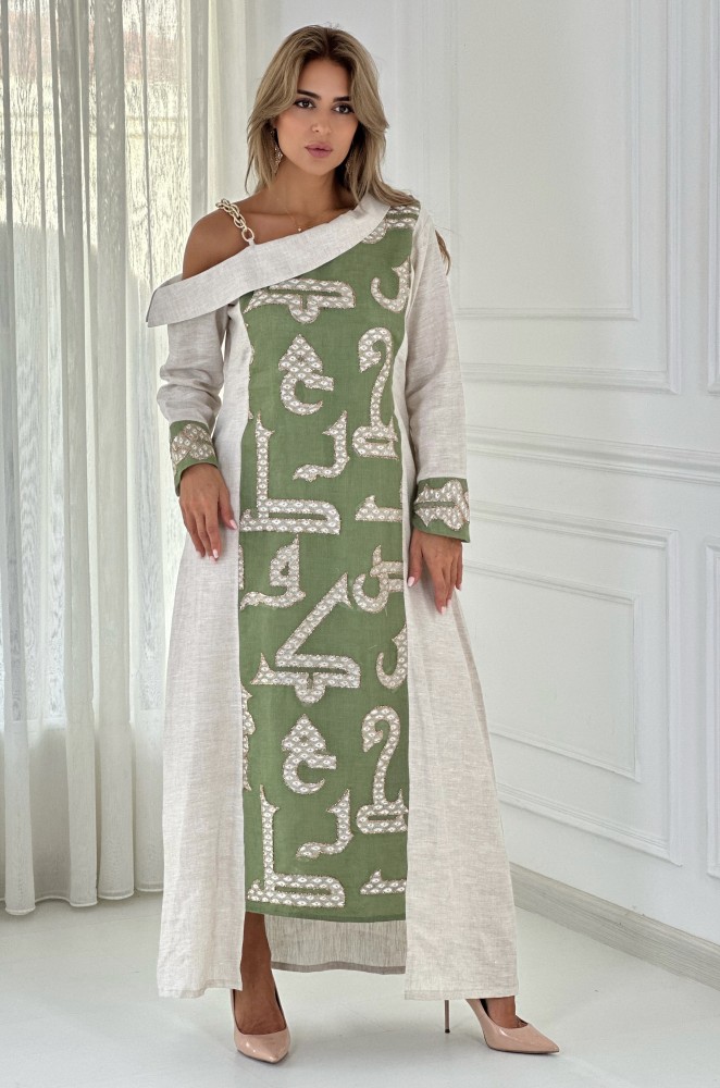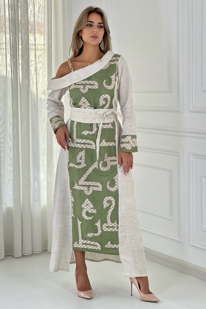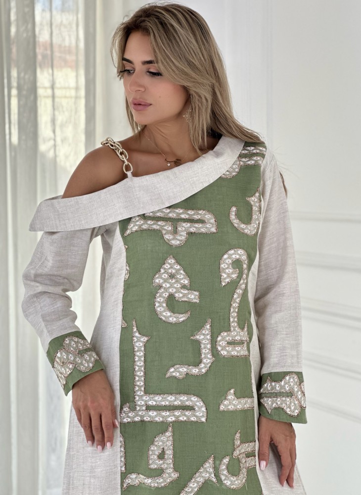 ثوب اللينن مطرز تطريز أحرف مع حزام يُعد خيارًا مثاليًا لإطلالة تجمع بين الراحة والأناقة