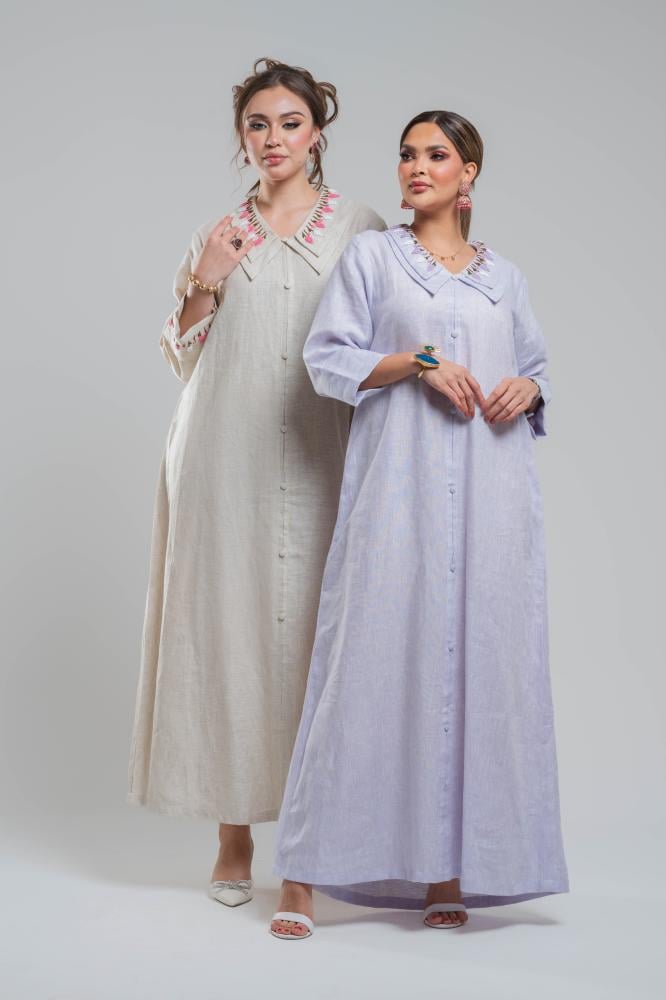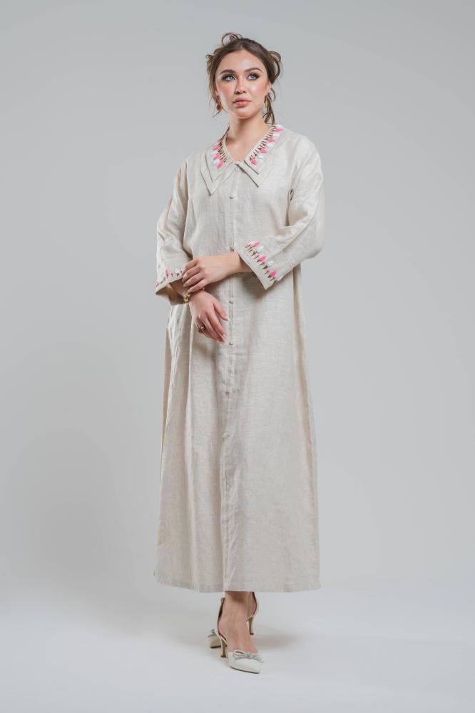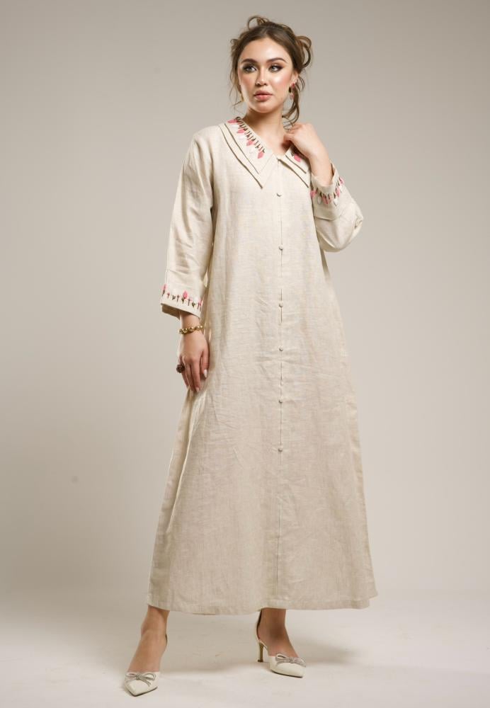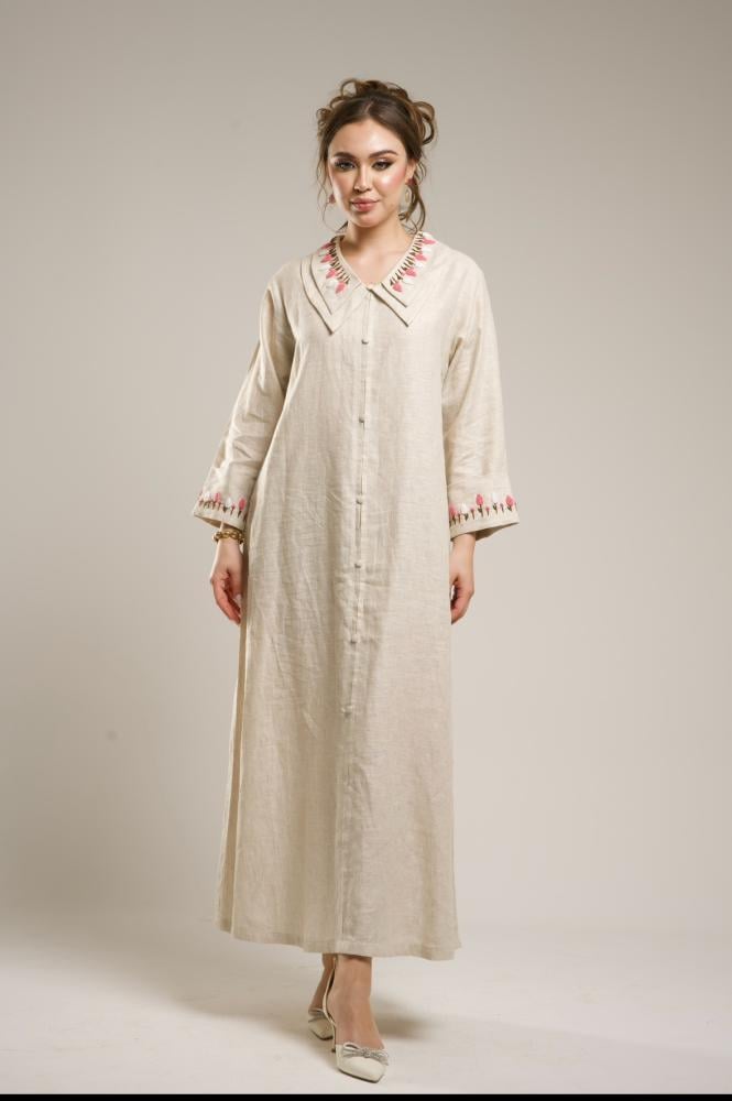 ثوب رمضاني لينن تطريز يدوي و ياقة مطرزة تطريز أنيق و مصممة بدقة لأن التفاصيل تصنع الفرق .