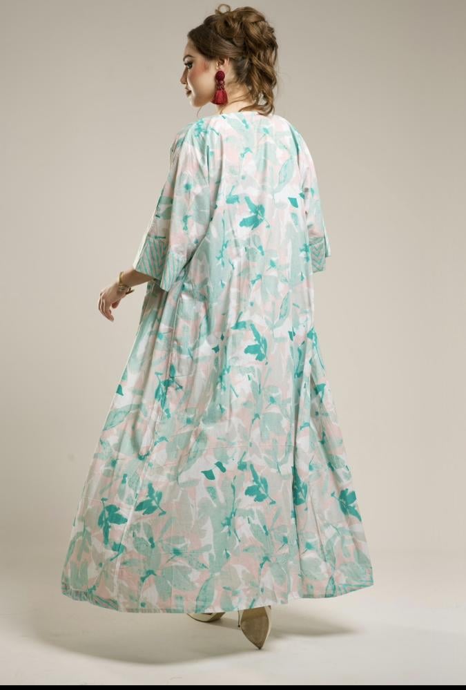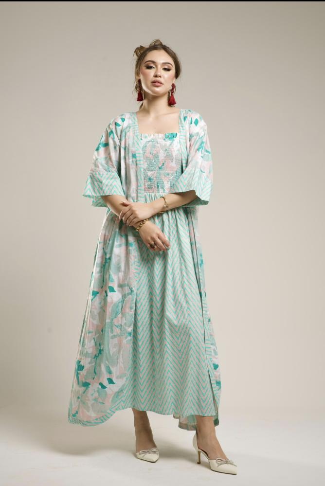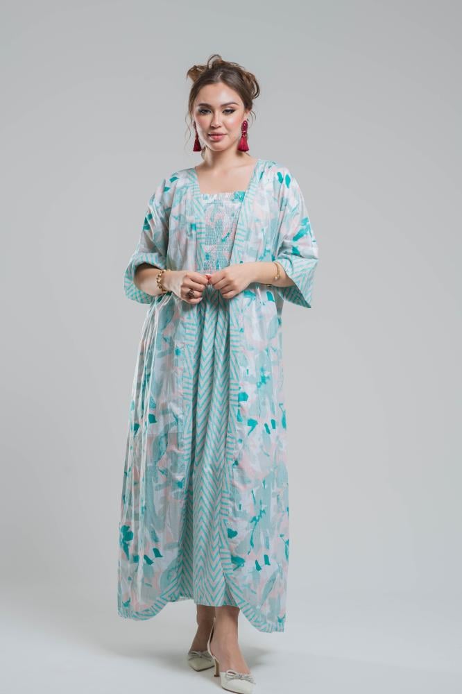 فستان مع عباية و طرحة قطني خفيف وبارد، بتصميم أنيق و تطريز فاخر يمنحك الراحة والفخامة في كل مناسبة